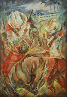Aunque la escena sugiere la lucha los machetes que otros ven aquí son solo sugerencias muy abstractas, aunque de imaginarlo es posible en una obra por principio polisémica dada a la libre interpretación y por lo del rojo presente que sugiere sangre como resultado de la lucha. .